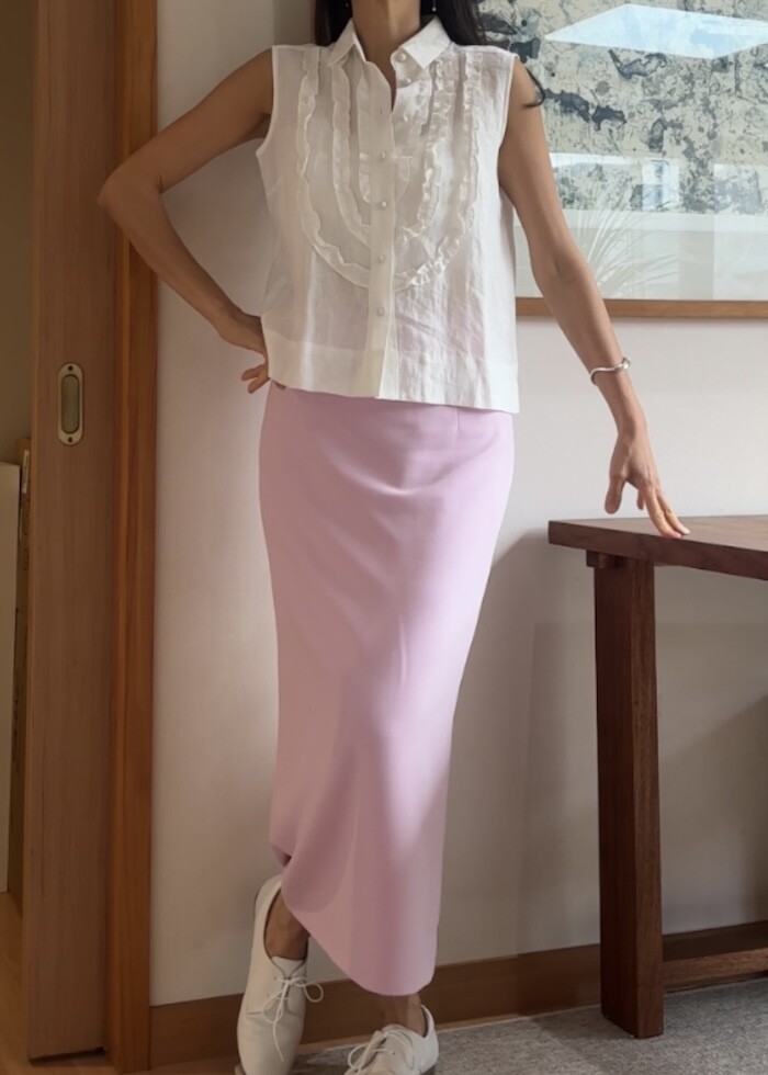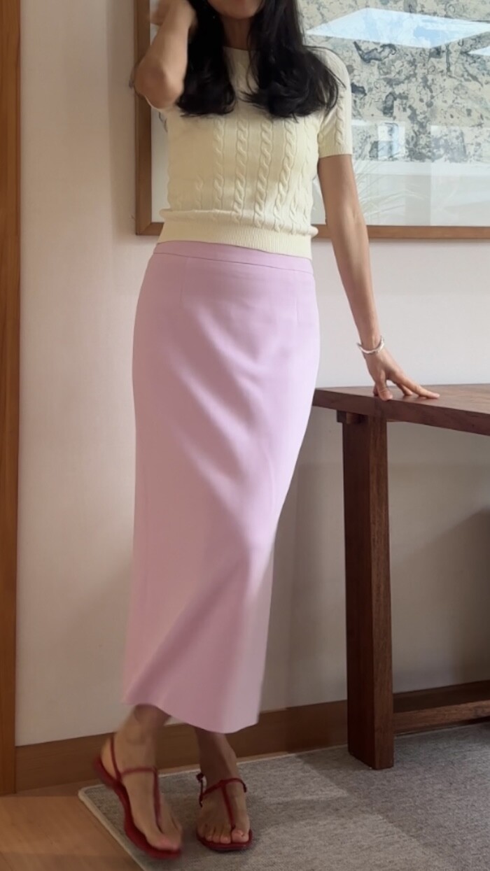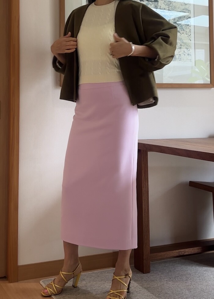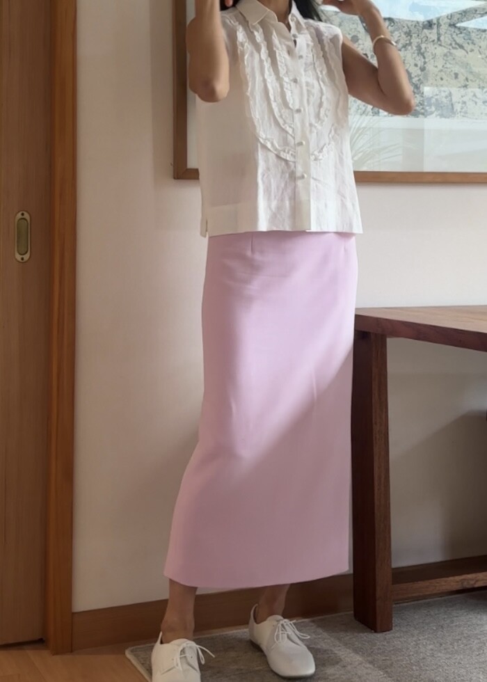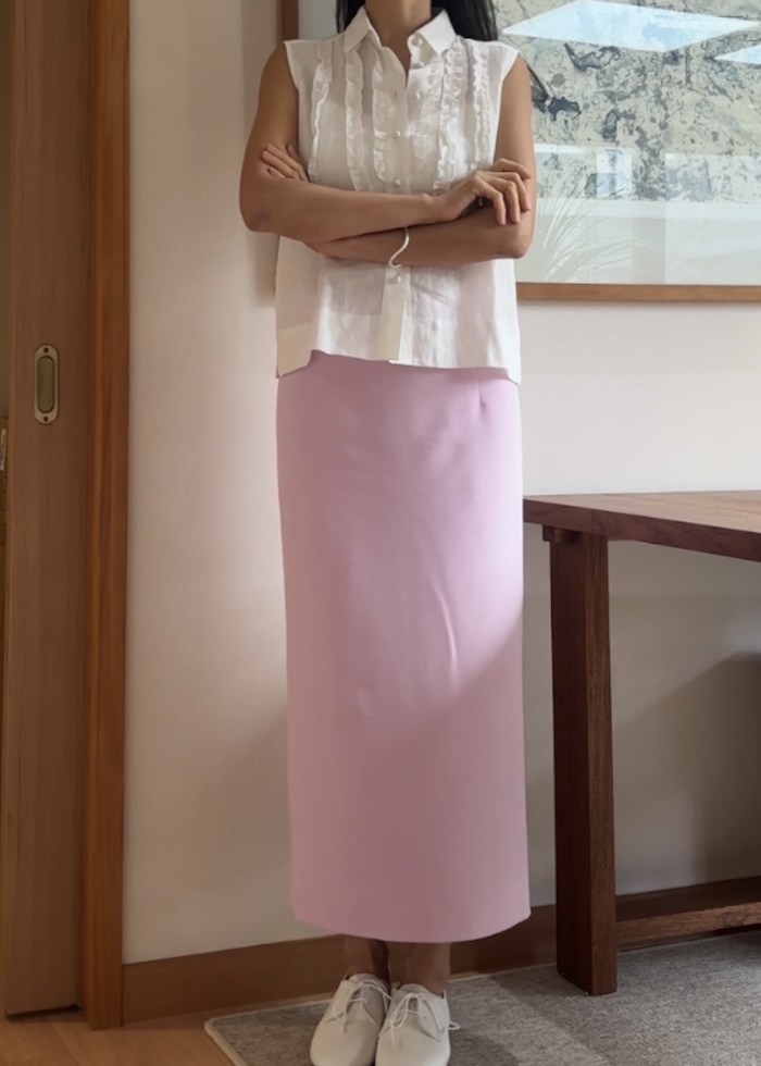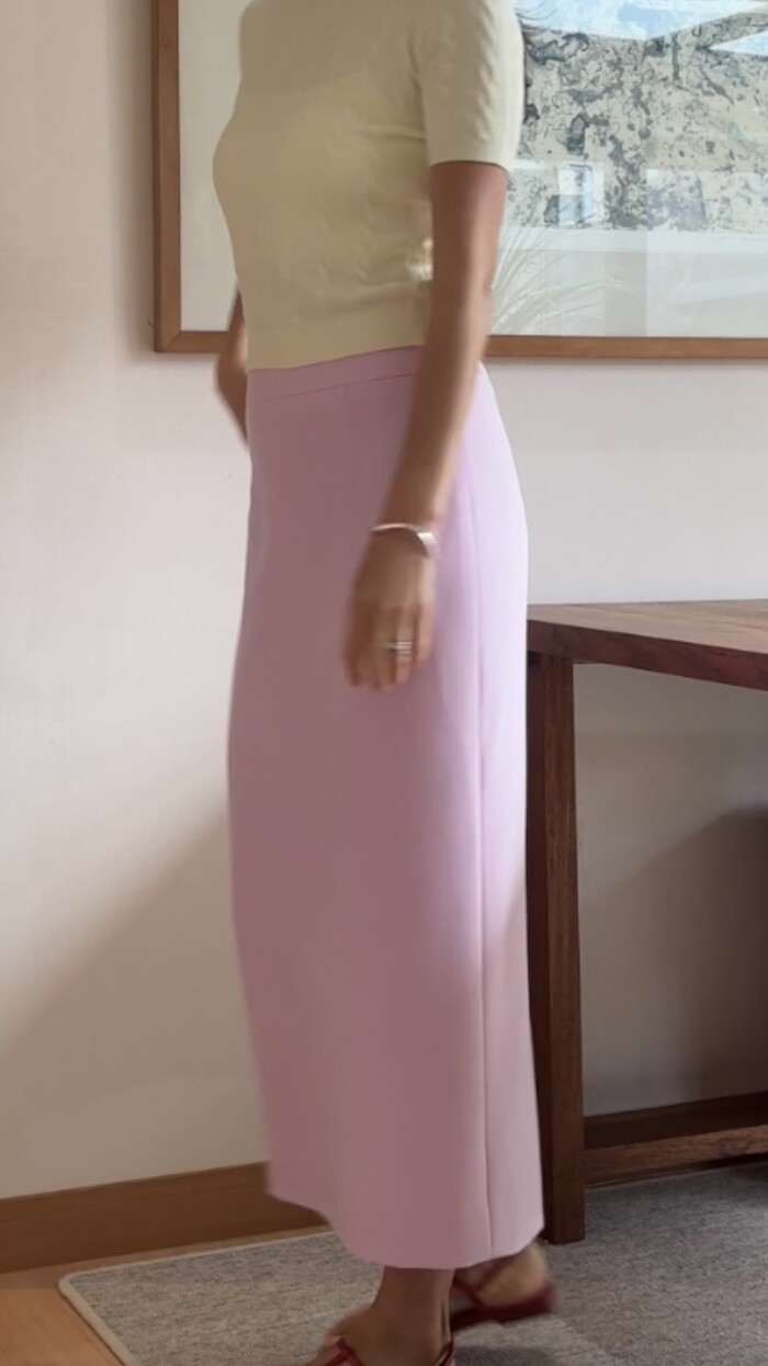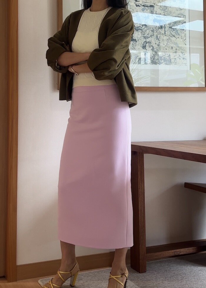 옆지퍼에 주머니 없이 A 라인으로 떨어지는 클래식한 스타일입니다.