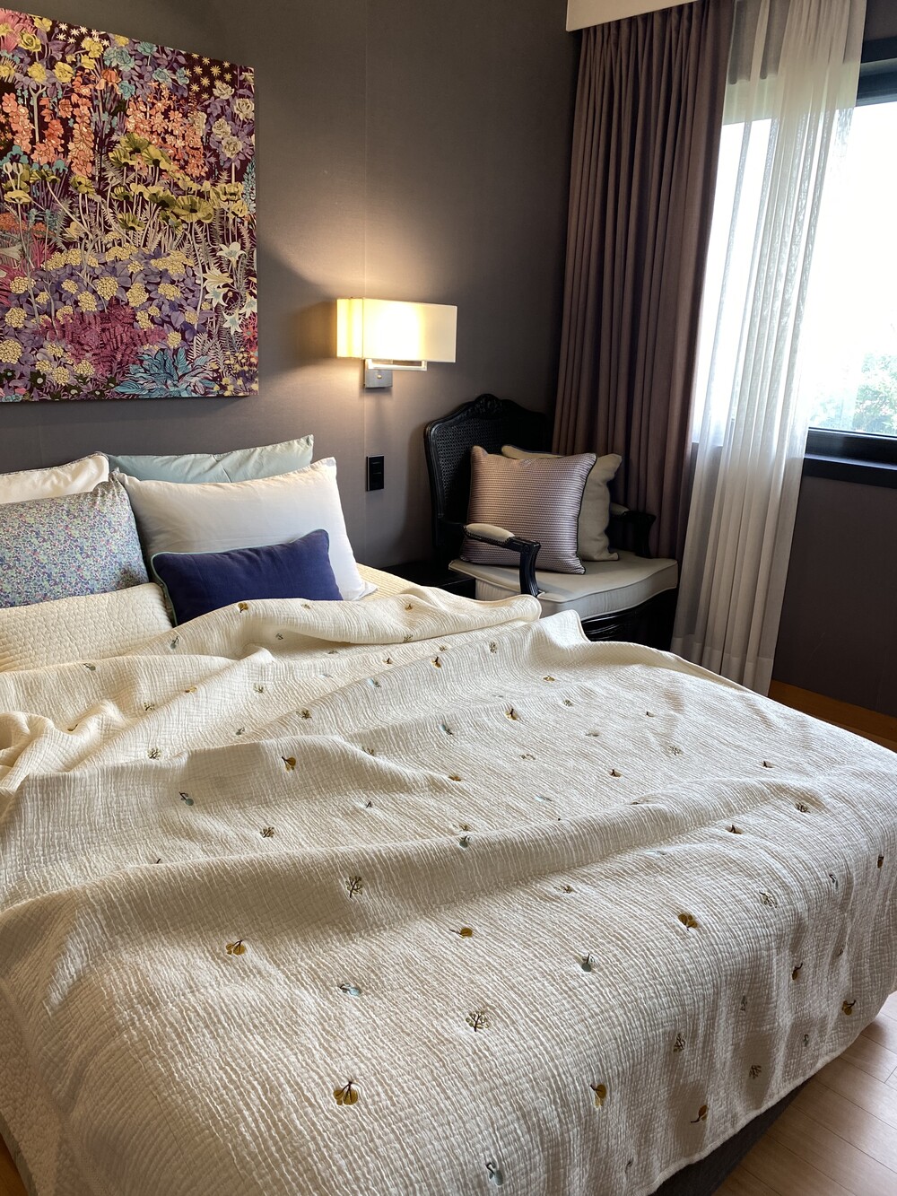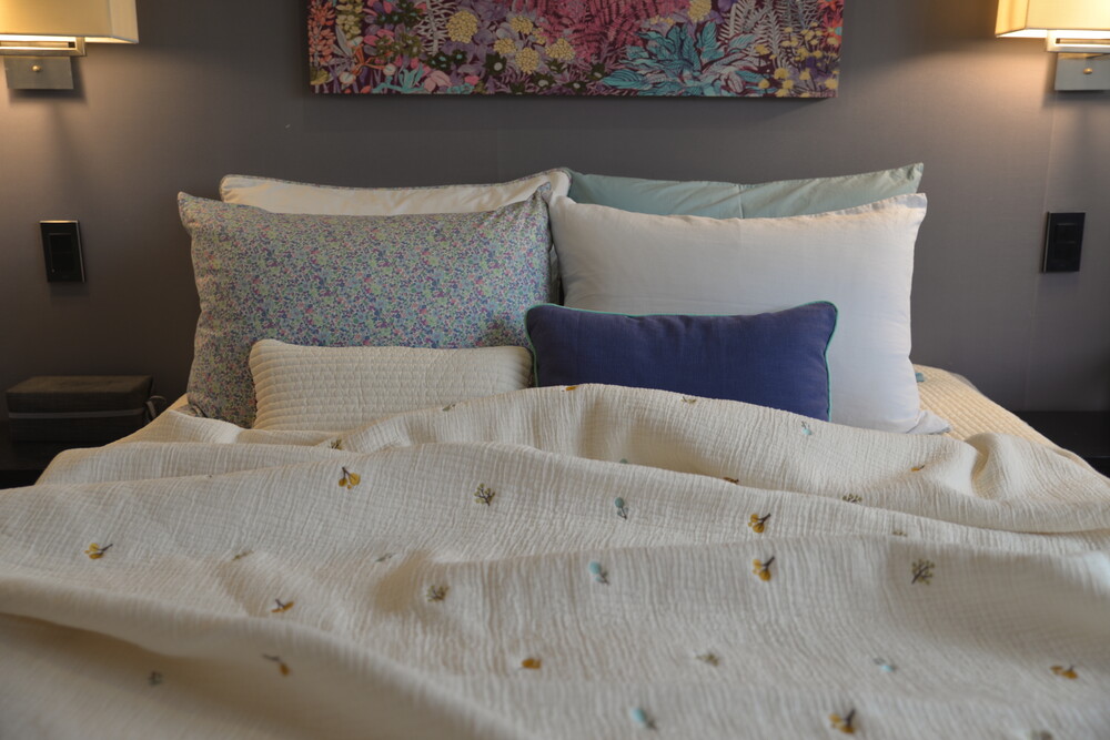 덮는 사이즈는 싱글이나 수퍼싱글이지만 가로로 연출하면 침대 스프레드 느낌으로 사용하기에도 사이즈가 적당합니다.