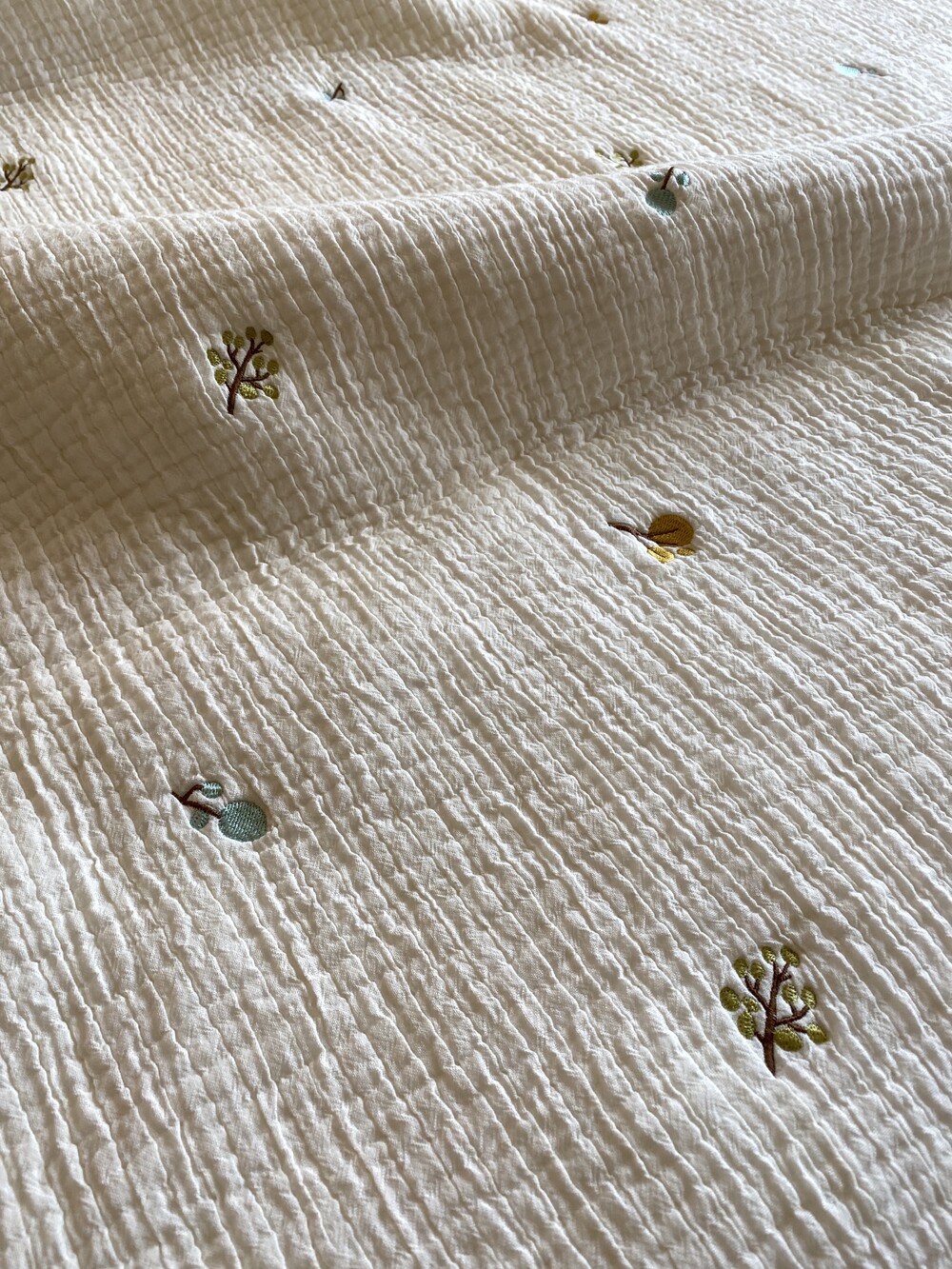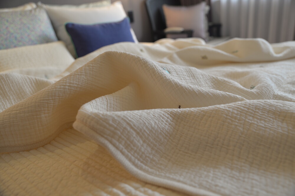 유아용침구로 많이 사용하는 부드러운 거즈 원단이 양면에 있고 안에 얇은 솜을 넣어 누빈 원단입니다.