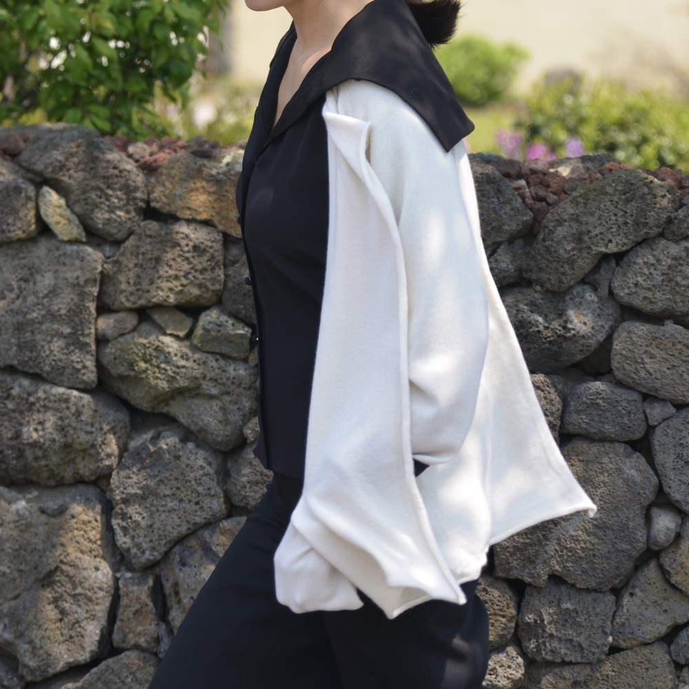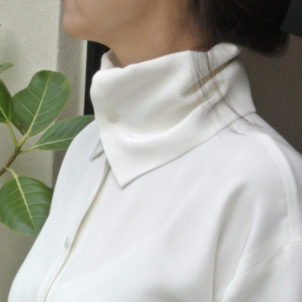 앞 단추를 채워서 스카프 느낌이나 자연스러운 터틀넥 분위기로 연출할 수 있습니다.