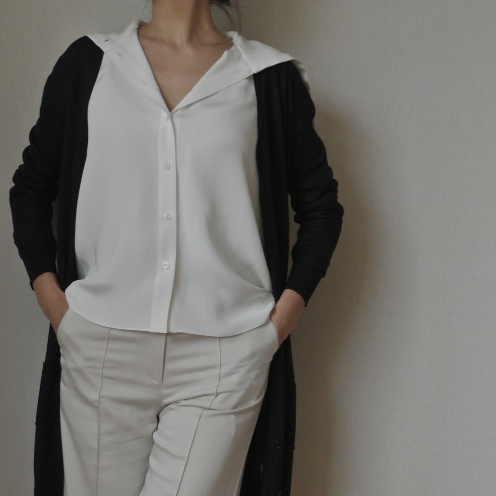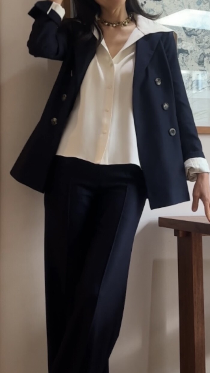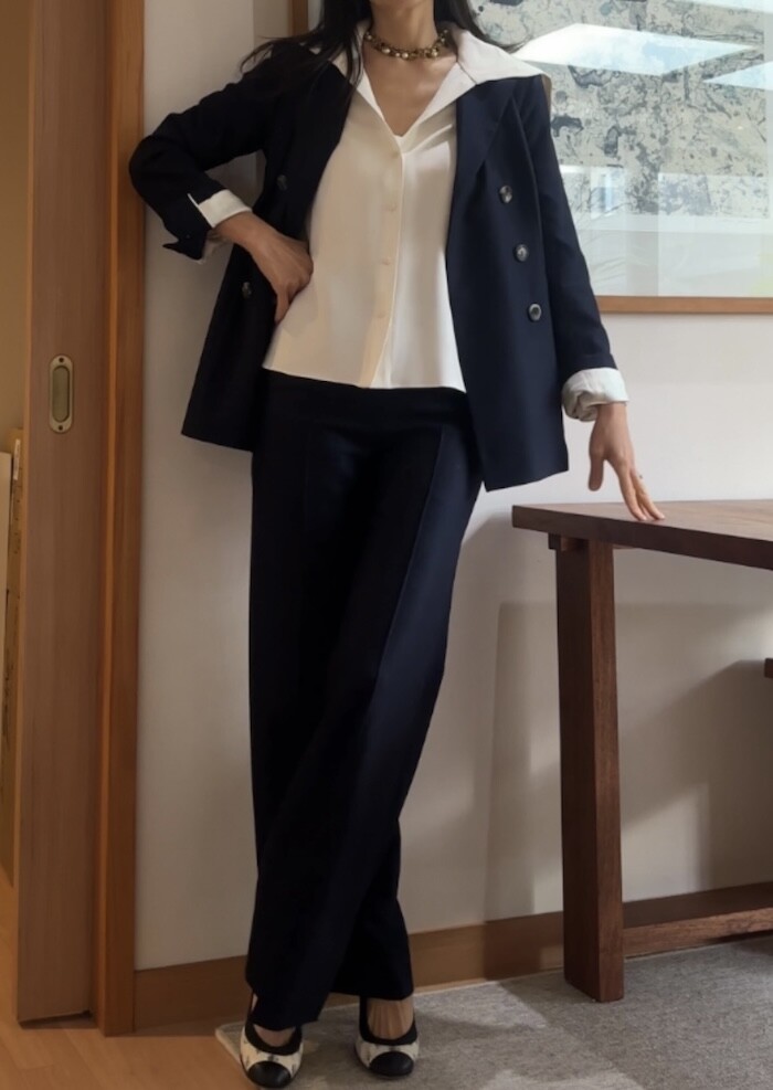 자켓이나 코트 안에 세일러 카라를 넣어서 입으면 V넥 이너로 코디하실 수 있습니다.