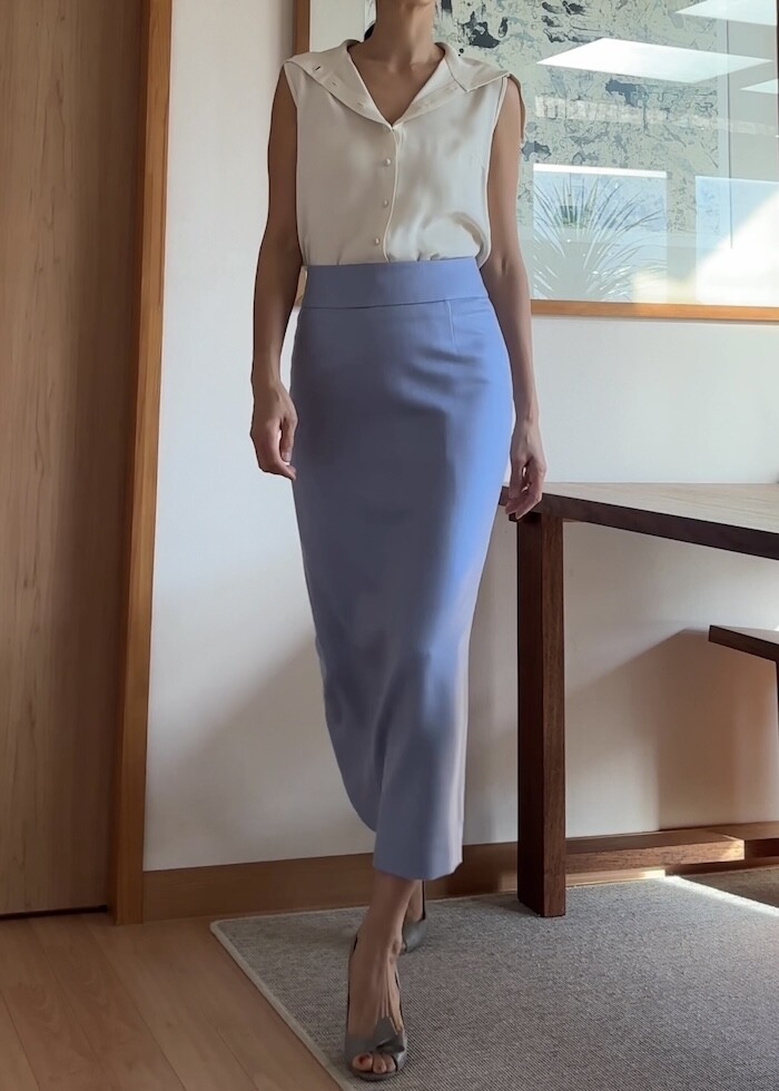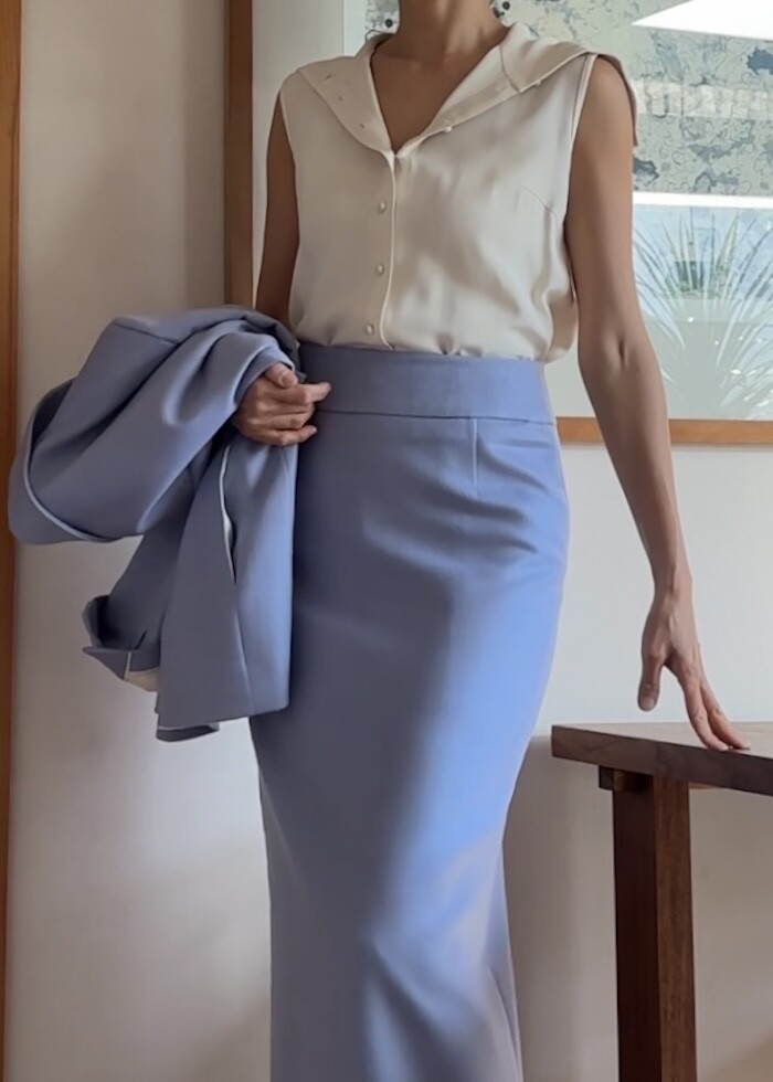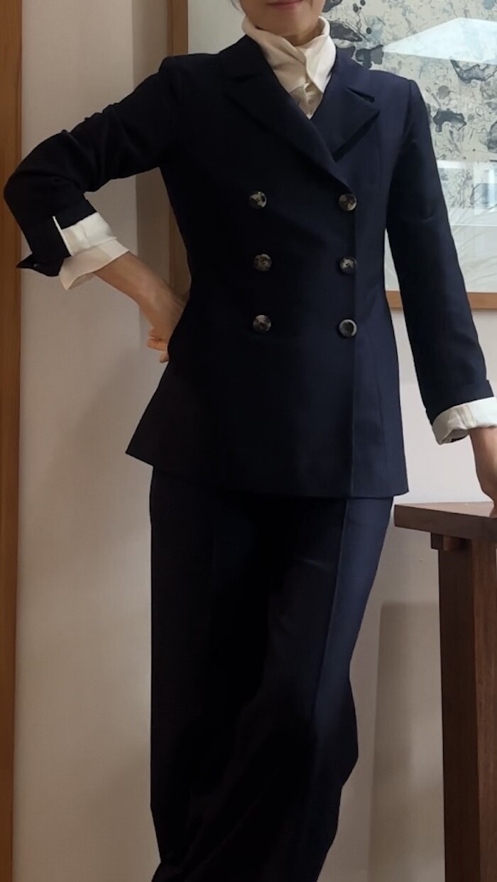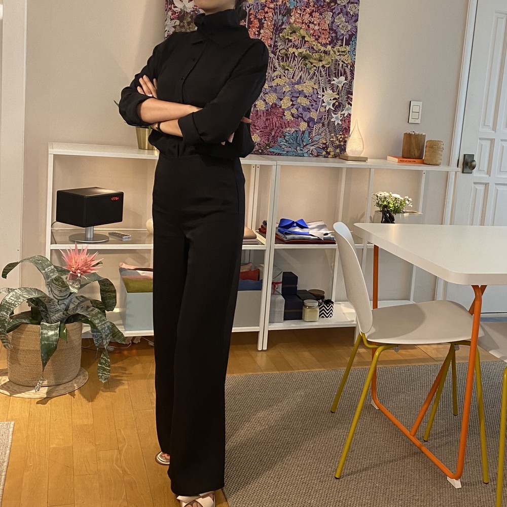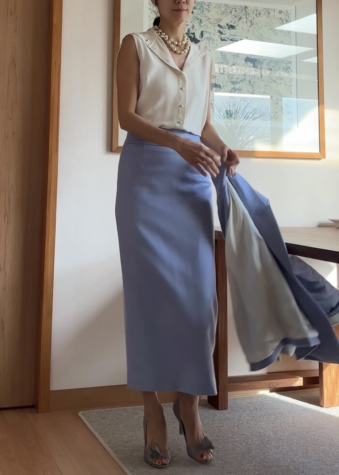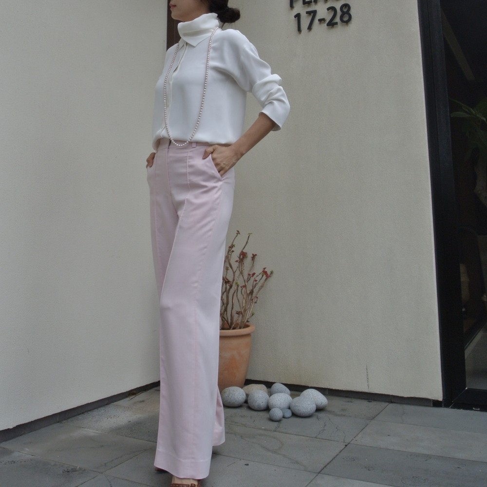 소재가 100% 실크임에도 바지나 자켓을 만들수 있는 실크라서 도톰하고 크레이프 느낌으로 매우 자연스럽게 떨어지는 고급실크입니다.