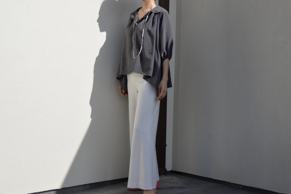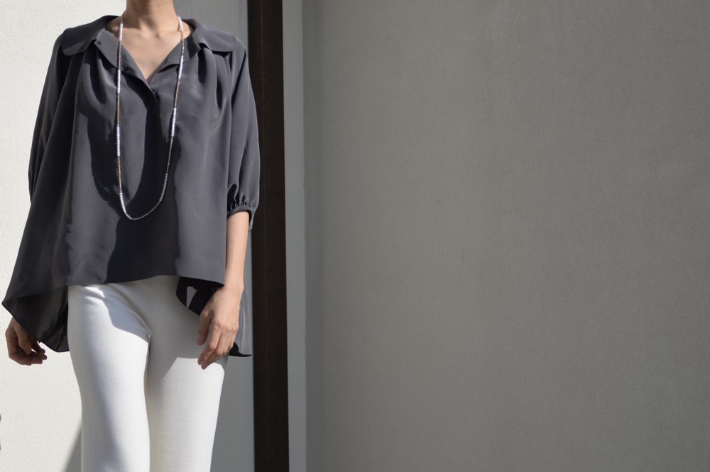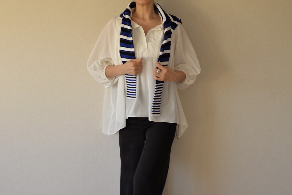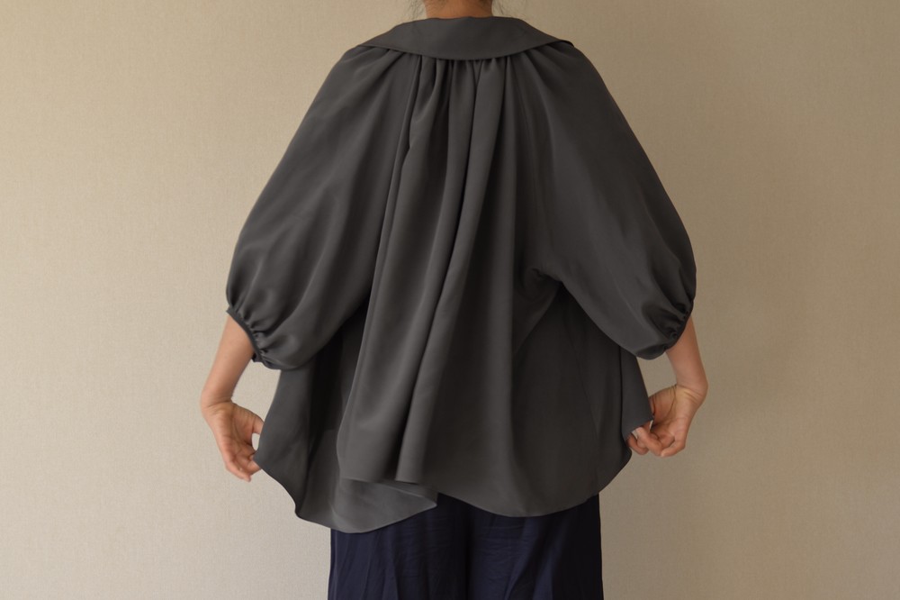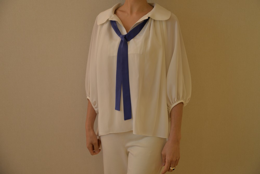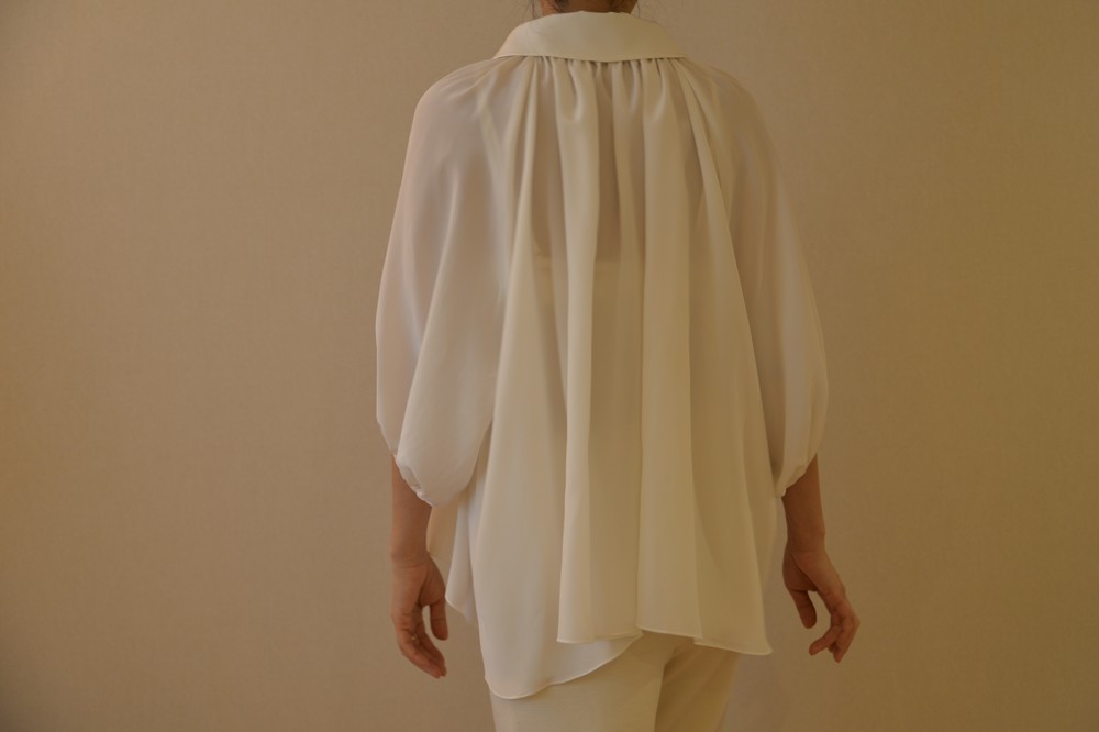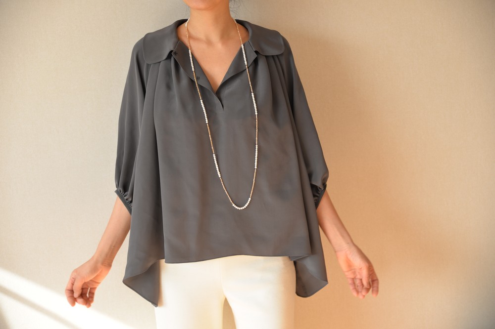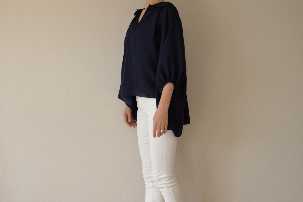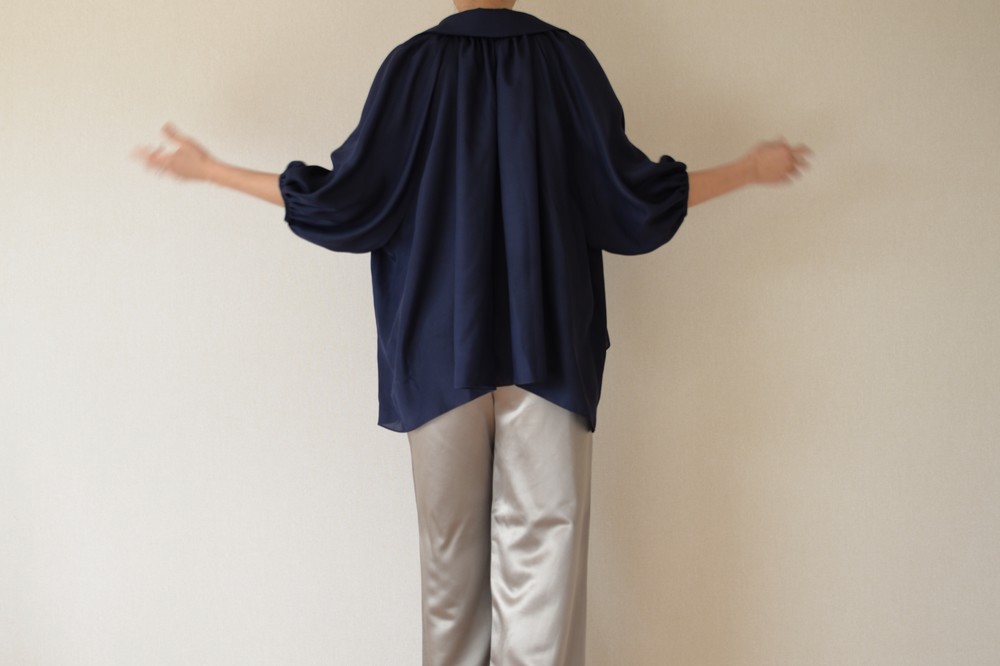 연출하기에 따라 활용도가 좋은 블라우스입니다. 카라가 좀 큰 피테팬 카라여서 옆 여밈을 오픈하여 입으면 깊이 파인 브이넥처럼 입으실 수 있고, 단추를 채우면 클래식한 느낌으로 연출 가능합니다. 전체적으로 주름이 많아 드레시한 느낌과 박시한 분위기로 누구나 입어도 어울린다는 장점이 큰 스타일입니다. 엉덩이와 배 등 가리고 싶은 곳을 가리면서 우아함과 멋스러움을 함께 누리실수 있습니다. 리본을 감아 연출하면 카라가 살짝 세워지면서 작아집니다. 같은색상 또는 다른배색으로 하의와 맞추셔도 좋을 것 같습니다. 실크의 고급스러움이 시선을 압도하여 볼륨감이있어도 뚱뚱해 보이지 않는 큰 장점이 있습니다. 자연스럽게 드레이프되어 앞보다 뒤와 옆이 길어서 엉덩이와 옆선을 가려 하체의 노출 부담이 덜하고, 그 무엇보다 뒷태가 매우 아름답습니다. 워낙 실크와 주름으로 화려함이 꽉 차기에 소매는 최대한 심플하게 만들었습니다. 소매가 사선으로 떨어져 팔목이 가늘어보이는 효과가 있습니다. 이너로 입으실 때는 가디건이나 자켓등을 잘 연출하면 배색 효과도 매우 좋습니다.