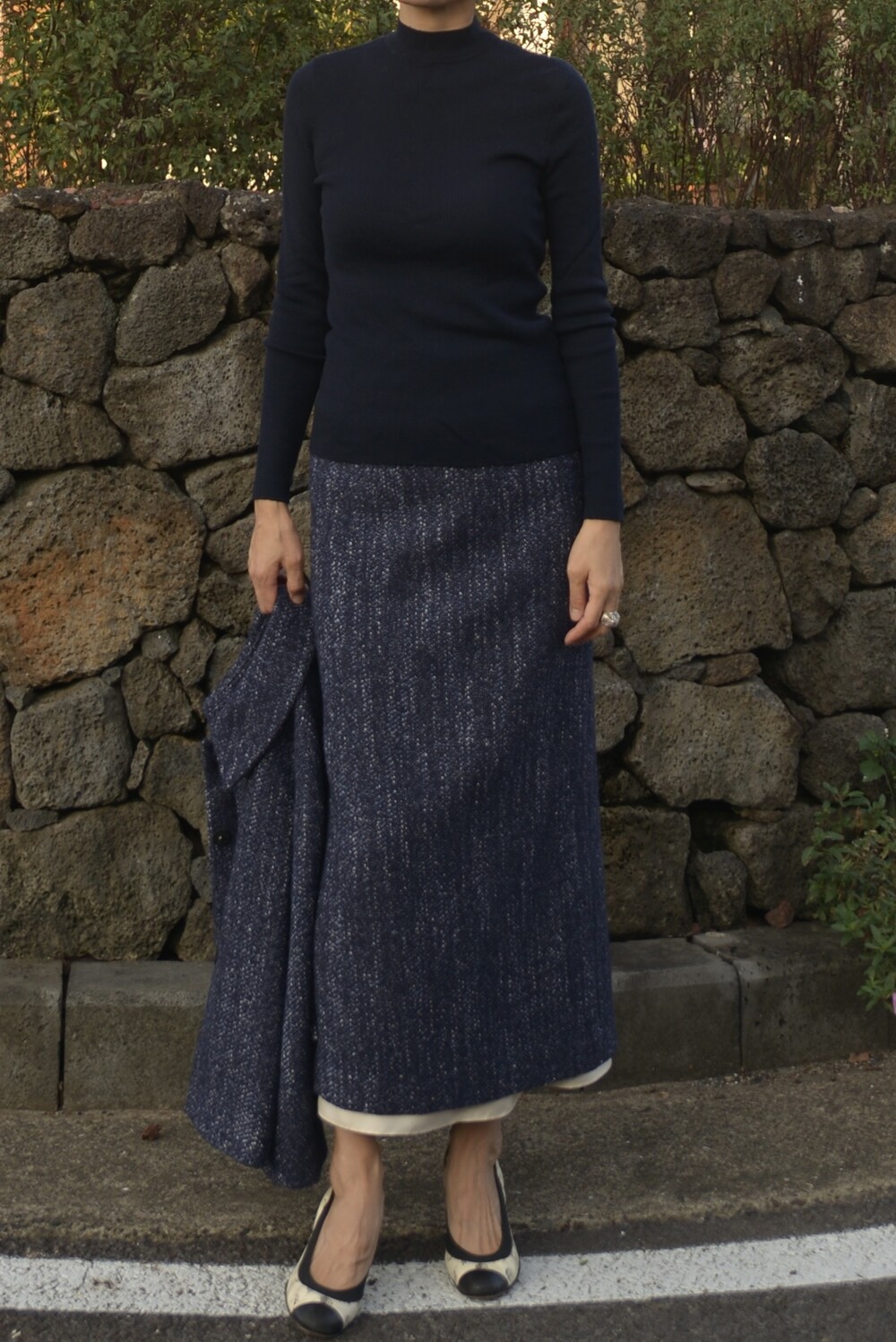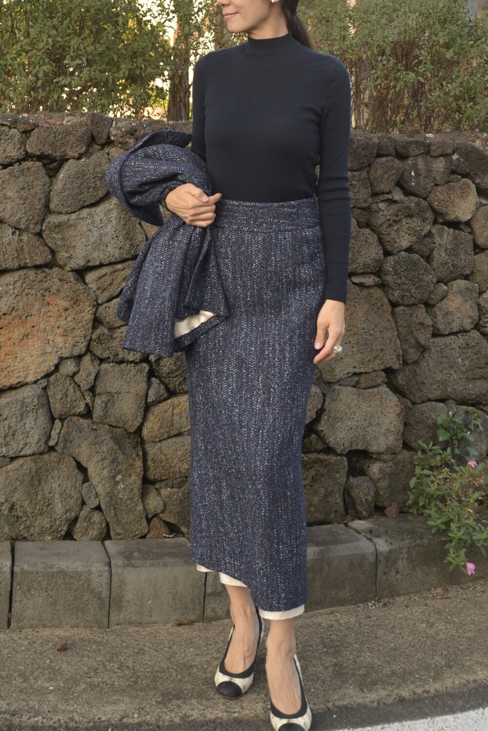 트위드 소재가 퉁퉁해 보일수 있지만 그만큼 체형커버가 되고 소재가 단단해서 약간 여유있게 입어도 생각보다 쉬운 스커트입니다.