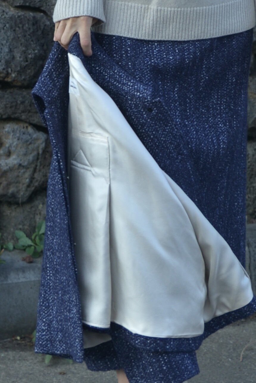 자켓 안감과 같은 색상 트윌실크로 촉감도 부드럽고 안감이 레이어링되어 밑단과 뒷트임이 보이게 입는 매우 여성스러운 디자인입니다.